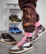 The Air 1 Travis Scott features a white leather upper with suede overlays leather reversed Swooshes. Hits of red on the tongue slightly contrast the design’s earth tones. On the heel, a debossed Cactus Jack logo adds a custom feel.
