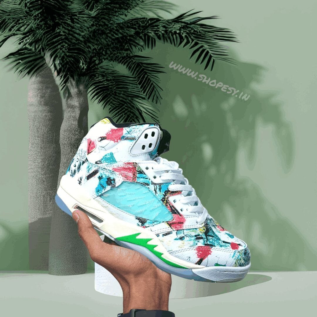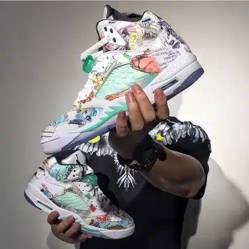 Supplied by a premier sneaker marketplace dealing with unworn, already sold out, in demand rarities. Each product is rigorously inspected by experienced experts guaranteeing authenticity. These are the only wings it takes to fly. Crafted from multicoloured leather, the Air 5 Retro wings from Branded are finished with all-over graphic prints to have you soaring. Take off and fly high. Featuring a round toe, a lace-up front fastening, a logo patch at the tongue and a rubber sole.