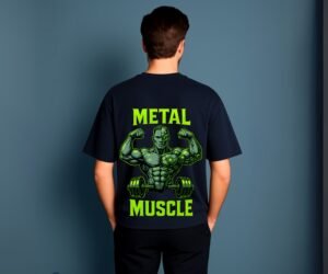 Fibix Men’s Oversized Pure Cotton Metal Muscle Graphic T-Shirt – Navy Blue