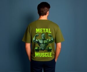 Fibix Men’s Oversized Pure Cotton Metal Muscle Graphic T-Shirt – Olive Green