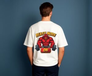 Fibix Beast Mode On Men’s Oversized Pure Cotton Gym T-Shirt – White